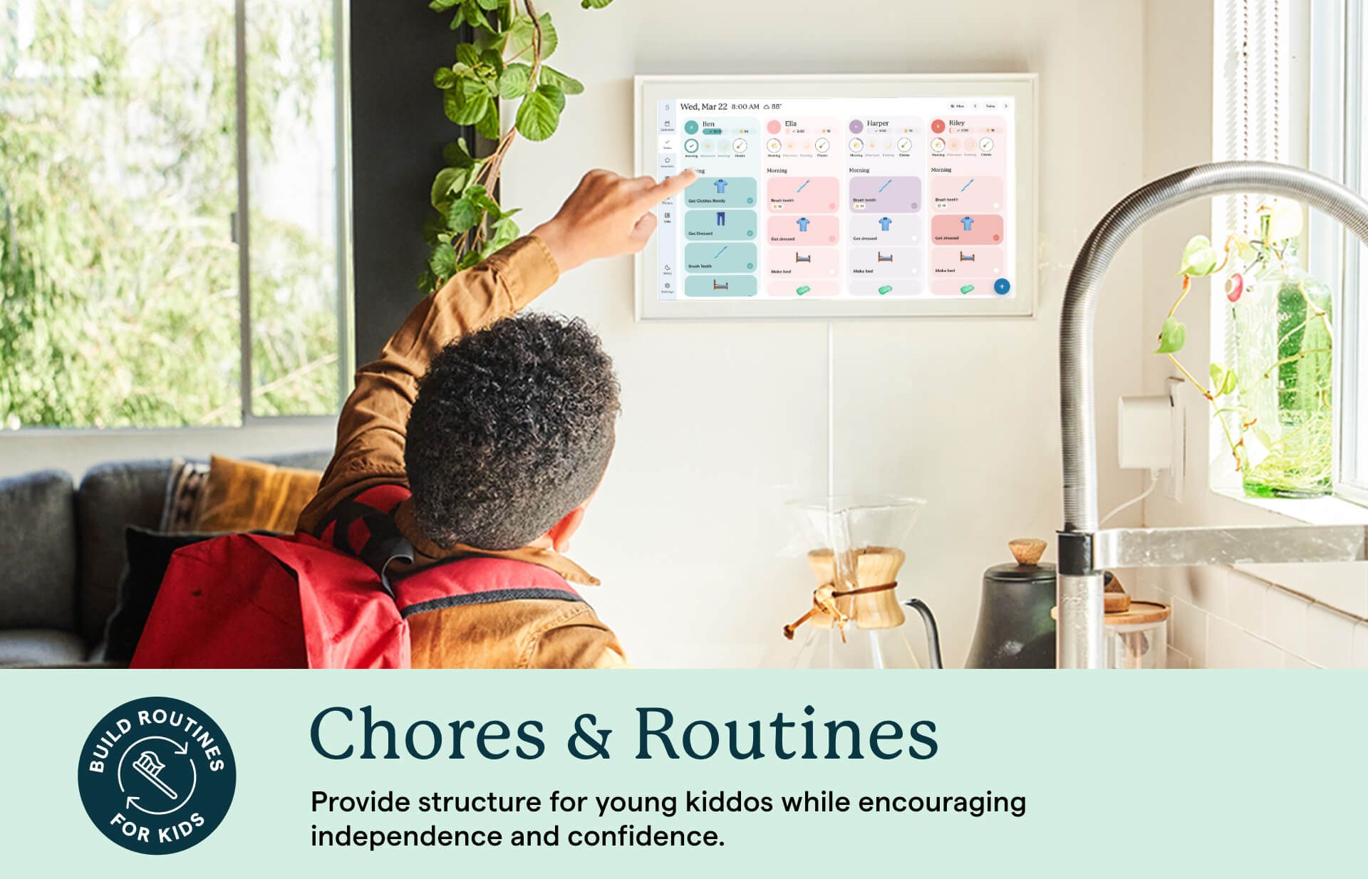 Children using the Skylight 15-inch digital family calendar to track chores and build morning routines on a wall-mounted smart screen.