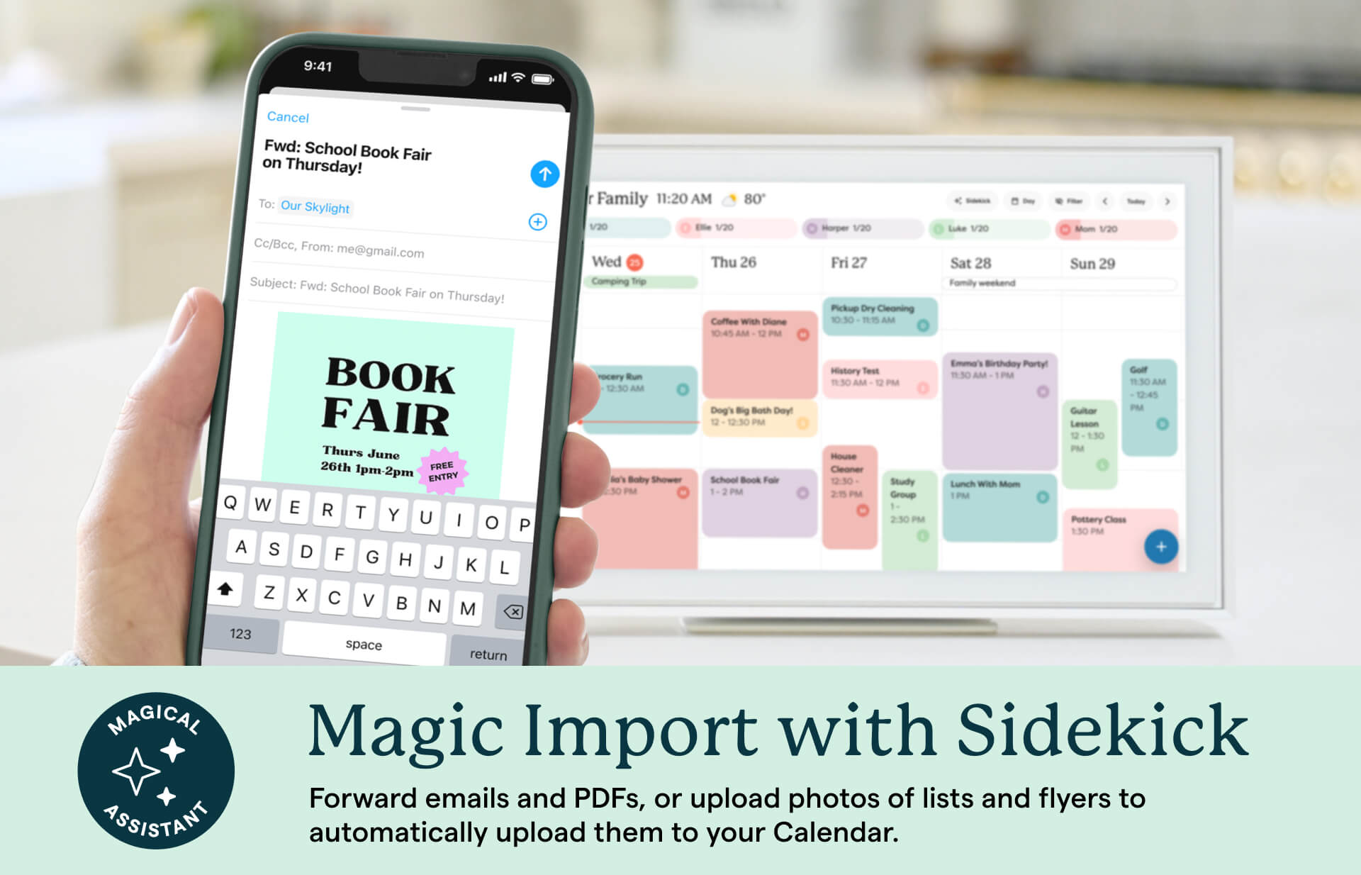 Skylight 27-inch family calendar automatically importing school flyers and appointments from email into the digital schedule.